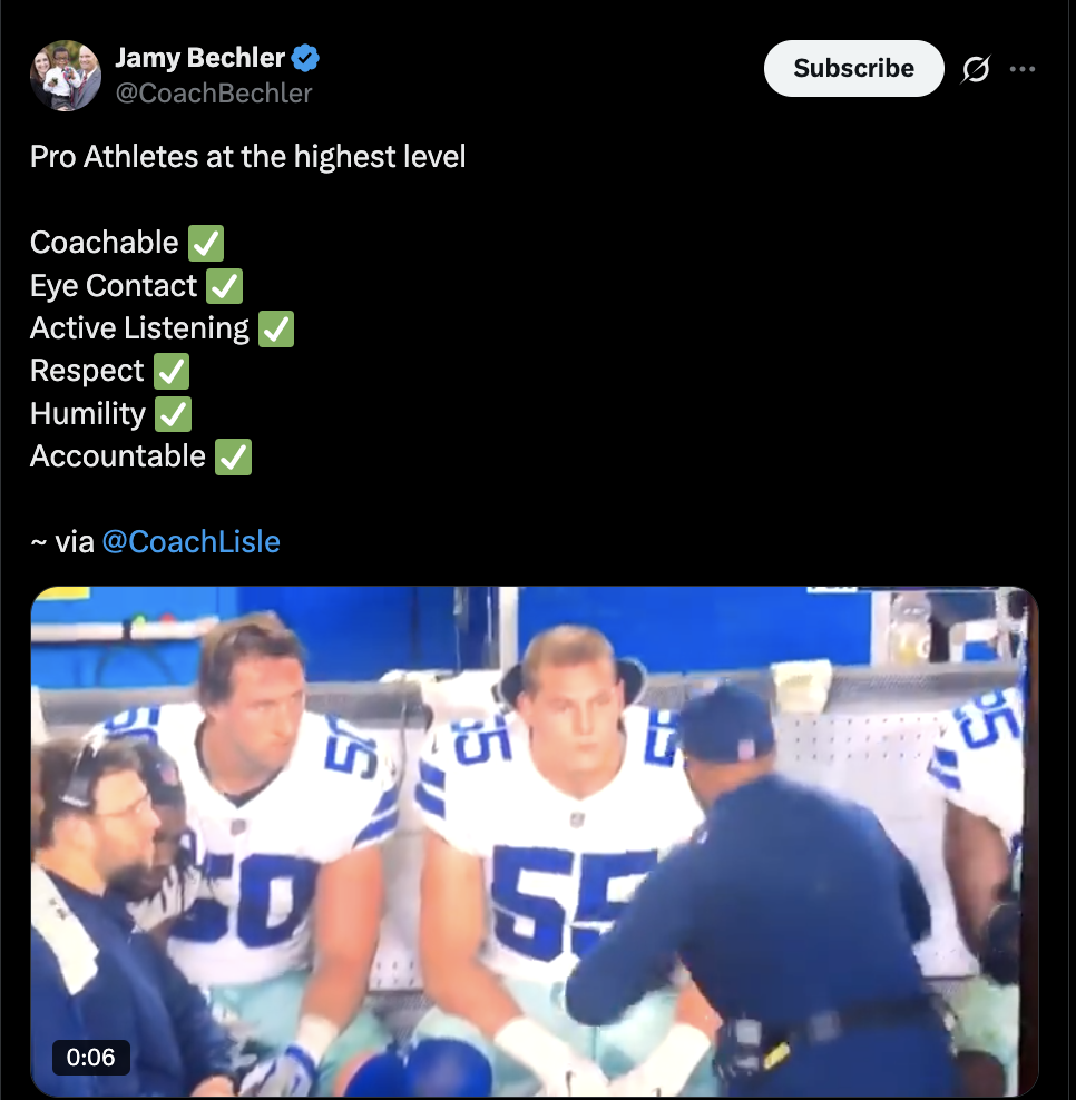 This is an old clip (no earlier than 2019 — the last year Kris Richard was Co-DC for the Cowboys) that keeps resurfacing in the “this is how you coach” or “back in the day you could yell at dudes” circles. In it, Richard is dog-cussing LBs Sean Lee and Leighton Vander Esch on the sideline. And according to the group-think logic, because he’s letting them have it, they’re somehow more coachable, accountable, locked in, etc.