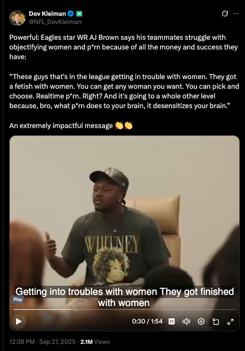 Eagles WR AJ Brown recent talk (shown above) is SPOT ON. This topic is probably one that players in our locker room need our voices the MOST in—but we as coaches are the LEAST likely to engage with. Porn use, and the impact it can have on a consumer’s psyche, expectations, and BEHAVIOR in intimate relationships.