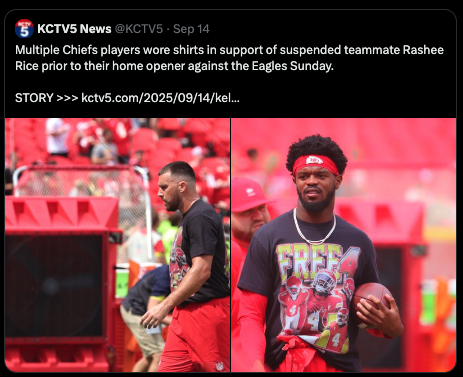 But THIS shirt—“Free Rashee Rice”—while it absolutely states exactly what the Chiefs think about the NFL’s punishment of their teammate (for his offseason high-speed crash that led to a hit-and-run and jail sentence) reeks of something else entirely: