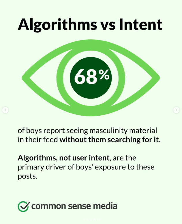 68% of boys report seeing masculinity content in their feeds without searching for it.