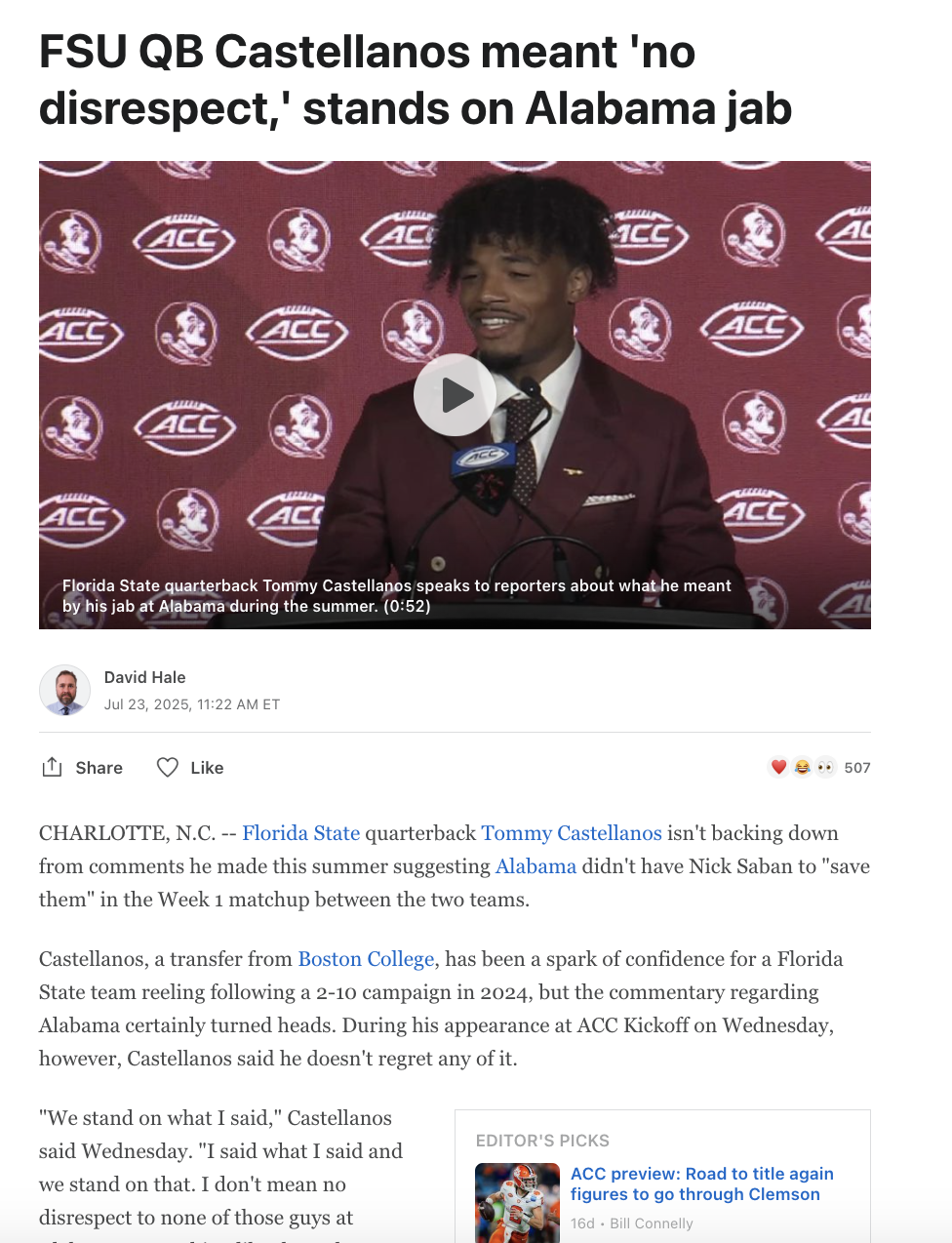 Today’s blog is reacting to and framing the recent controversy surrounding new FSU QB Tommy Castellanos.